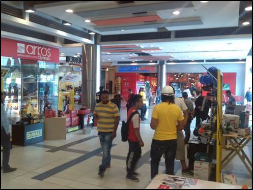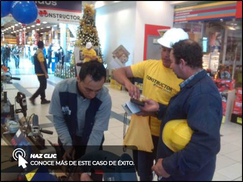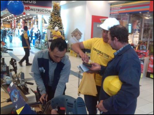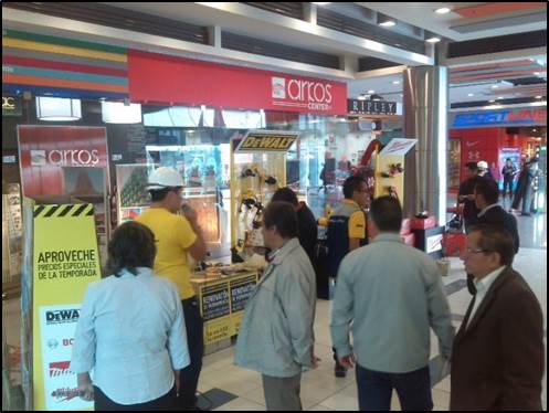 Estrategia: Se instalaron 4 exhibidores metálicos cada uno con un cubo de exhibición y una mesa de prueba de herramientas con la finalidad de que cada marca tuviese un espacio propio para exponer sus productos con sus múltiples promociones, la idea principal fue que los transeúntes se acercaran a los exhibidores motivados por un animador y dos logísticos que atreves de volantes y sonido en vivo invitaban a los clientes a experimentar y conocer las diferentes muestras de las herramientas.